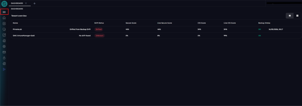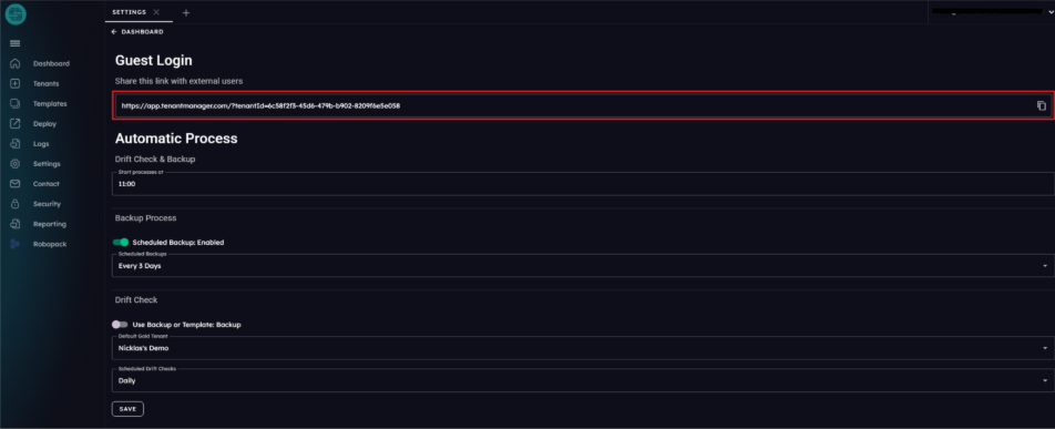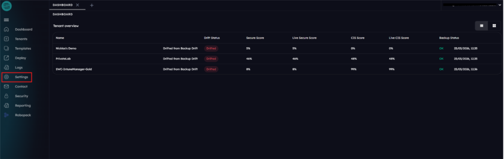 Result: The Settings dashboard will open, displaying settings related to the specific Tenant Manager instance.